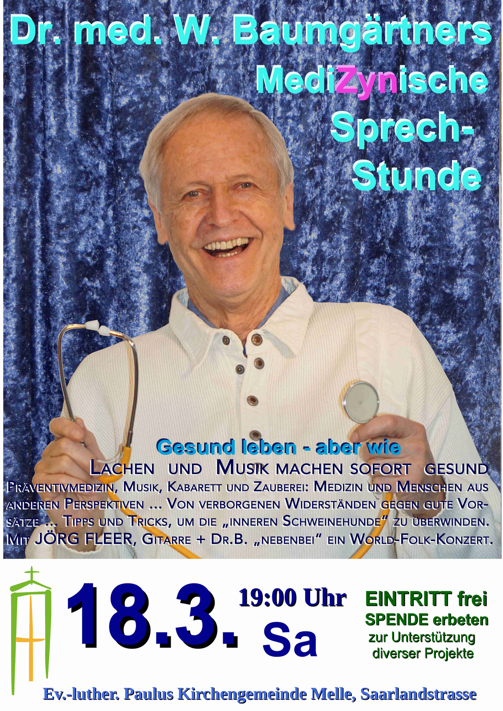 Dr. med. Wolfgang Baumgärtner ist Arzt für Psychotherapie und Allgemeinmedizin, Musiker und Dozent. Zusammen mit dem Gitarristen Jörg Fleer bringt sich der „DOKTOR“ auch musikalisch ein, was den Abend „nebenbei“ beinahe zu einem Konzert macht und aussagt, dass „Musik genauso notwendig ist für die Gesundheit, wie Bewegung und Ernährung!“ Es geht neben allem Humor um Anstöße und Anregungen zum Mitdenken und Gestalten, um „NOTWENDigkeiten“ – auch und gerade angesichts der zunehmenden Umweltproblematik und sogar vor den Hintergründen des Ukraine - Krieges ...