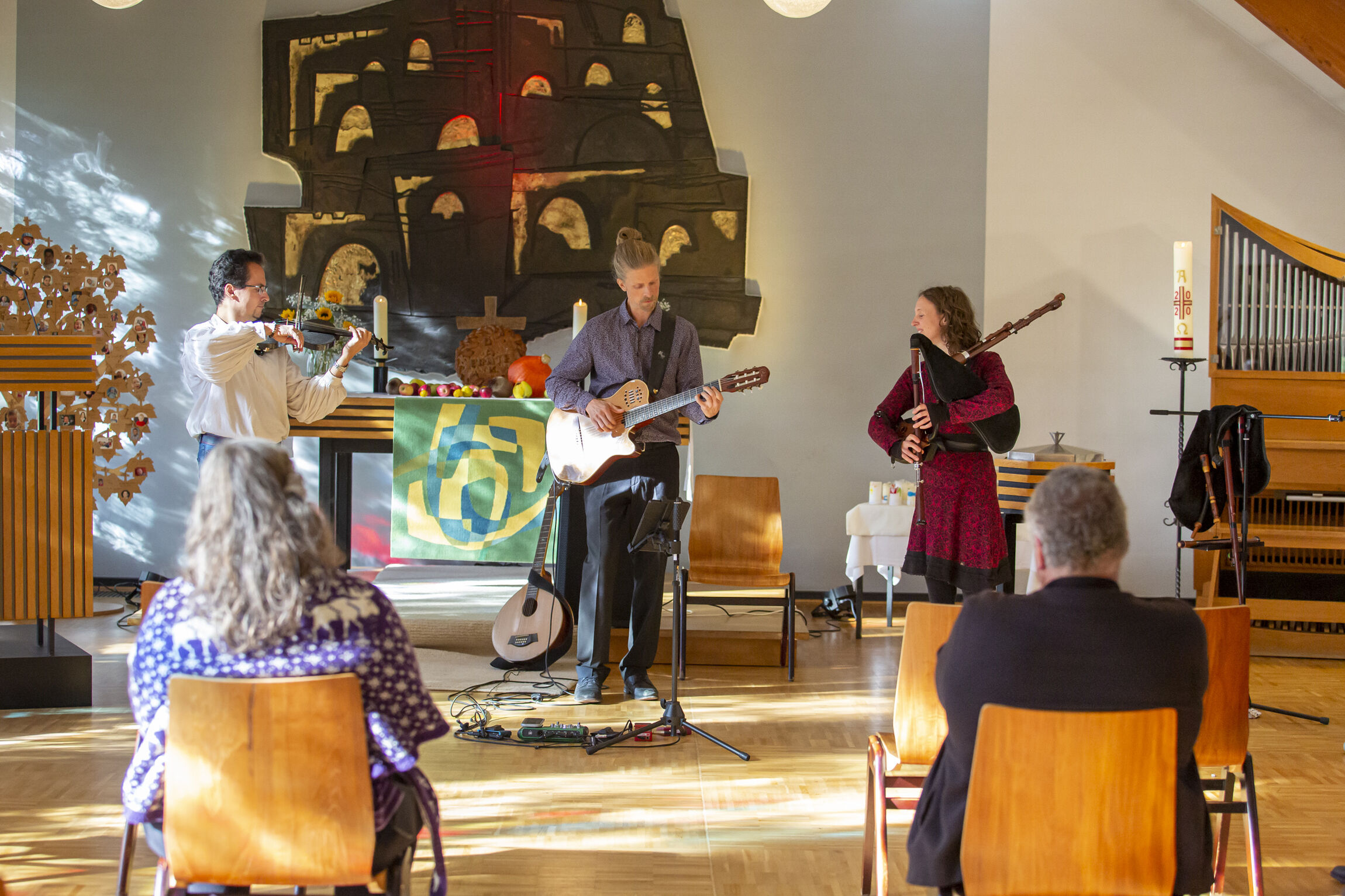 Nach einem großen und feierlichen Erntedankgottesdienst am Vormittag, der nur kurz von etwas Regen überschattet wurde, spielte am Nachmittag die Gruppe Silja deutsche Volks- und Tanzlieder aus dem 18. Jahrhundert.
