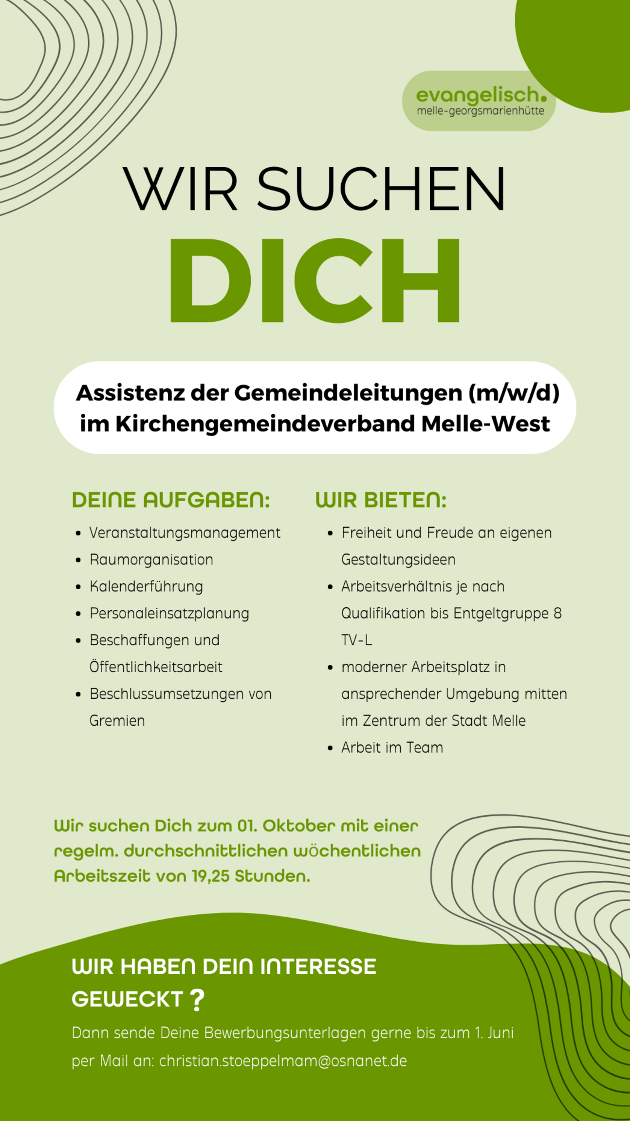 Wir suchen zum 1. Oktober 2024 eine Assistenz der Gemeindeleitungen (m/w/d) im Kirchengemeindeverband Melle-West mit einer regelmäßigen durchschnittlichen wöchentlichen Arbeitszeit von 19,25 Stunden. Die drei Ev.-luth. Kirchengemeinden St. Petri Melle, Paulus Melle und St. Marien in Melle-Oldendorf haben einen Kirchengemeindeverband gegründet und ein gemeinsames Kirchenbüro geschaffen. Die Assistenz soll alle drei Gemeinden in organisatorischen und administrativen Bereichen verantwortungsvoll unterstützen.